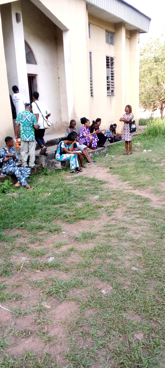 group of people sitting on the steps and on the ground outside a building in Okigwe, Nigeria, a small city in the southeastern state of Imo