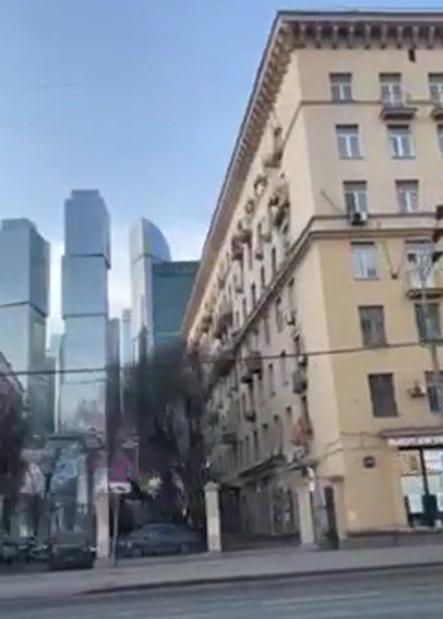 series of buildings in an urban setting, likely a city. The buildings have a mix of architectural styles, with some appearing older and others being modern skyscrapers. The sky is visible and appears to be clear. There is a street with traffic and pedestrian activity. There is a sign that says "Ломбард" in Russian. The video appears to have been taken from a moving vehicle.