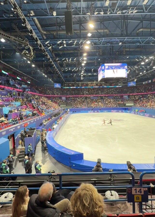 figure skating pair skating in a large indoor arena filled with spectators. The rink is oval-shaped and surrounded by blue boards. A large screen above the rink shows a close-up of the skaters. People are seated in rows of seats in the foreground, watching the performance. Some are filming the skaters with their phones. The arena's ceiling is high and features a complex network of lights and support structures.