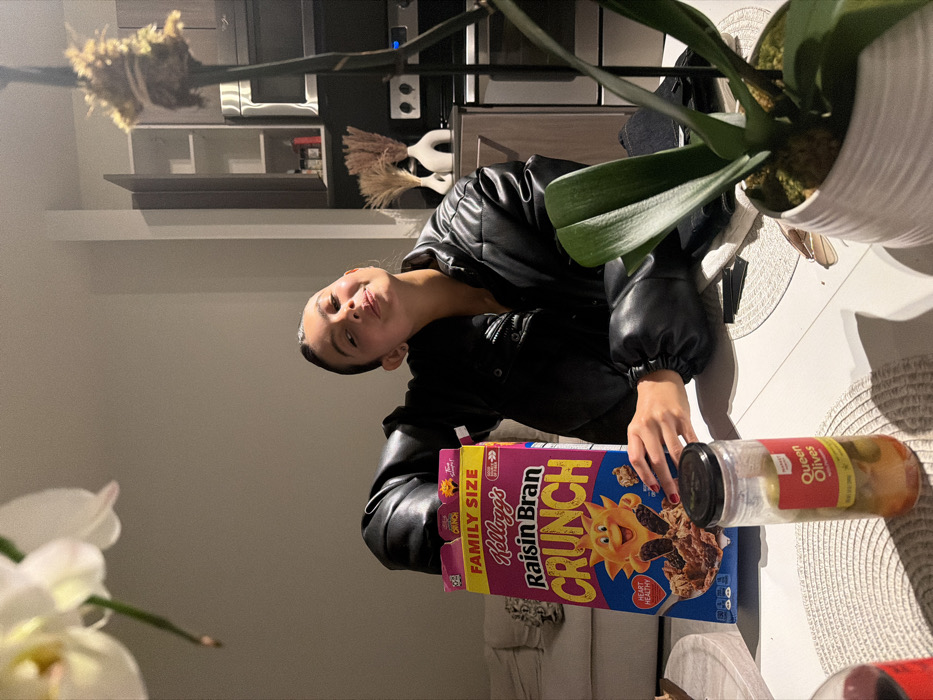 - "A woman in a black leather jacket stands behind a box of Kellogg's Raisin Bran Crunch cereal and a jar of green queen olives on a white table" by FM-VpEfG2, licensed under CC BY 4.0