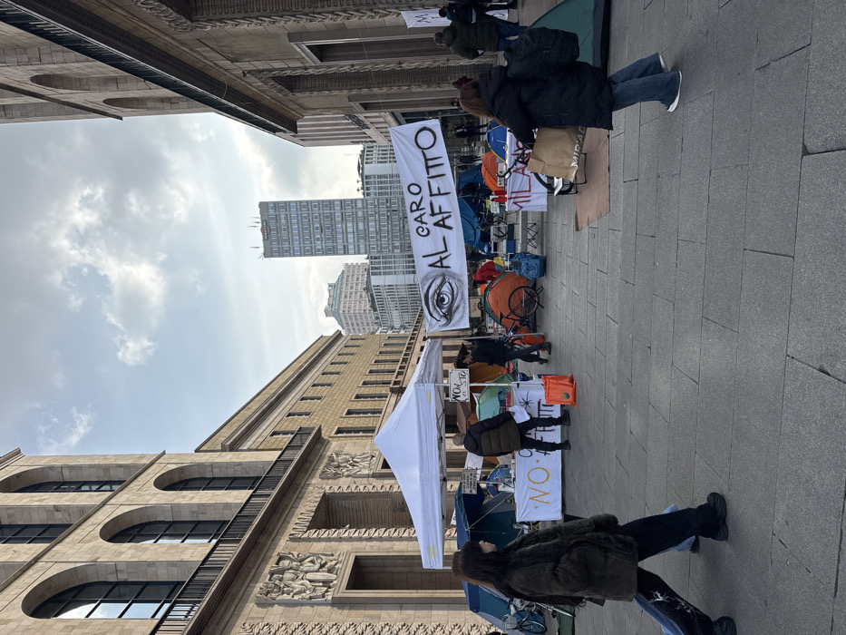 - "The image depicts an outdoor protest encampment situated on a paved urban square in Largo Augusto, Milan, Italy, directly in front of the Palazzo di Giustizia (Palace of Justice)" by FM-uOdKs1, licensed under CC BY 4.0
