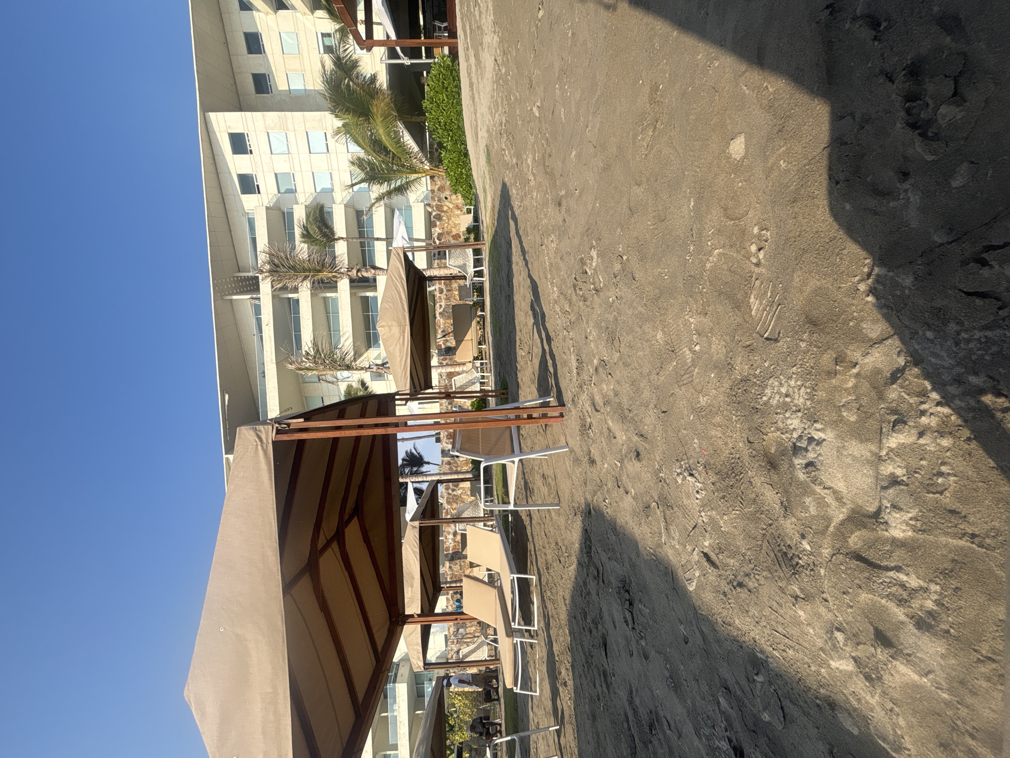 The image captures a beach scene in Acapulco de Juárez, Mexico, featuring sun shelters with beach chairs. The beach appears to be a sandy terrain with visible textures and footprints. Behind the shelters is a multi-story building with numerous windows and some palm trees. The sky is clear and blue.