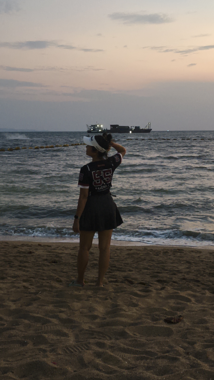 The scene depicts a sandy beach in Pattaya City, Thailand, at twilight. A solitary individual, identified as an adult female, stands with her back to the viewer, facing the sea. She wears a dark baseball-style jersey with "55" and "BASEBALL" in red and white on the reverse, a dark pleated skirt, and a white visor. Her left hand is positioned behind her head. The calm sea exhibits small waves approaching the shore, behind which a line of yellow buoys marks a boundary. On the distant horizon, multiple illuminated marine vessels are visible: a smaller boat generating a wake on the left, and two larger, darker vessels positioned centrally. The sky transitions from a faint orange and pink hue near the horizon to a darker blue-grey overhead, with sparse cloud cover. The foreground sand is textured with ripples and contains a small piece of dark debris on the lower right.