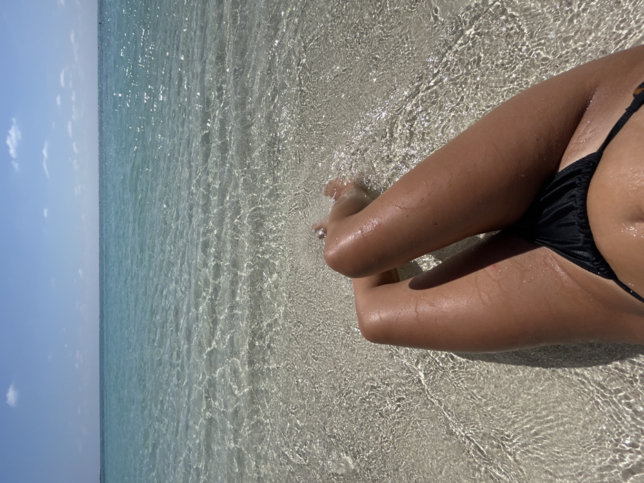 A first-person view captures the lower body of an individual resting in the shallow, clear turquoise waters of a beach in Thoddoo, Maldives