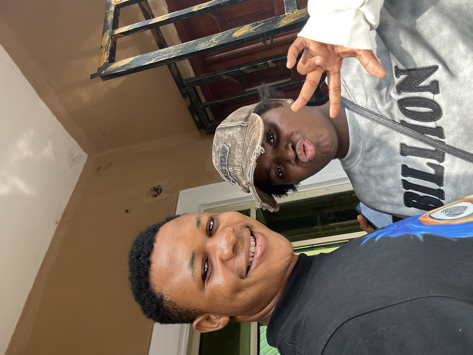 A close-up image depicts two individuals, a male and a female, posing together outdoors in Oyigbo, Nigeria. The male, positioned on the left, has short black hair and a light brown skin tone. He wears a black high-neck long-sleeved shirt with a partial colorful graphic design and smiles at the camera. The female, on the right, has a dark brown skin tone and wears a distressed camouflage baseball cap, a grey acid-wash long-sleeved sweatshirt with "BILLION" in raised black lettering, and a black thin-strap cross-body bag. She puckers her lips and raises her left hand, forming a gesture with the thumb and pinky extended. A white long sleeve is visible beneath her sweatshirt cuff. The background consists of a building's exterior featuring a light brown wall, a white ceiling/overhang with dark staining, and a partial white doorframe. To the far right, a black metal security gate with yellow/tan residue is visible in front of a reddish-brown door.