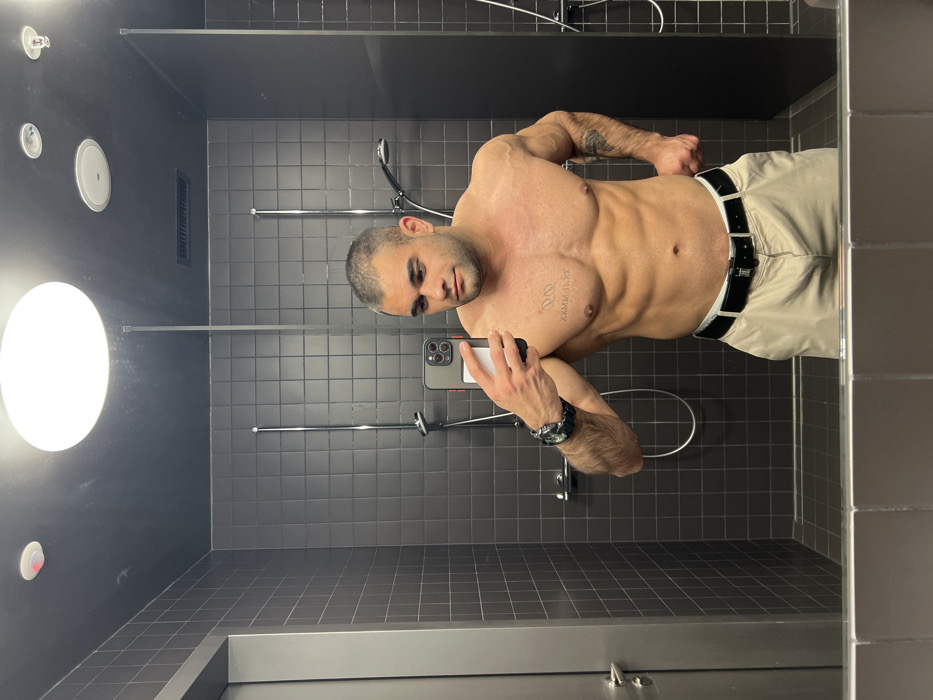 A muscular adult male is depicted from the mid-thigh up, taking a mirror selfie in a modern public shower facility in Basel, Switzerland