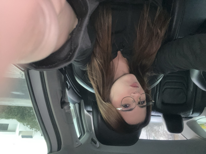 A young adult female is depicted in the driver's seat of a vehicle, taking a selfie