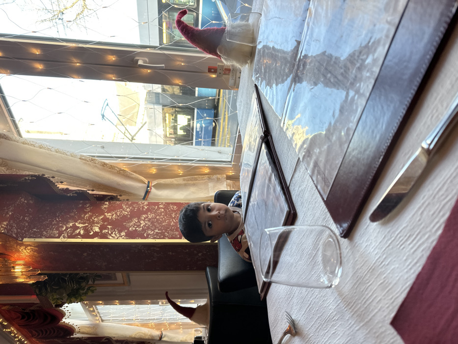 The image displays an indoor scene, likely a restaurant or café, situated in Zurich, Switzerland. A young child, appearing male with dark hair and a neutral expression, is seated in a dark chair at a table in the mid-ground, facing directly forward. The child wears a light-colored, multi-patterned shirt. The table in the foreground is covered with a white, textured tablecloth. Resting on it are three maroon-bound menu folders, an empty clear stemmed glass, a silver fork, and a silver knife. Decorative elements include a red and white gnome figure with a pointed hat placed on the table near the window on the right, adjacent to a small wooden block featuring a white cross (Swiss flag motif). Another red gnome hat is visible on a table in the left background. The interior walls are adorned with ornate, deep red wallpaper featuring gold floral patterns. Beige drapes with decorative valances frame the windows, which are strung with small, clear string lights. A multi-tiered light fixture, possibly a chandelier, is partially visible at the top. Through the large windows, a bright daylight street scene is visible. A light blue tram, characteristic of the Verkehrsbetriebe Zürich (VBZ) network, is prominently positioned on tracks outside. Overhead electrical lines (catenary) for the tram are also visible. Bare tree branches are discernible against a bright sky beyond the tram. The specific tram type confirms the location as Zurich, Switzerland.