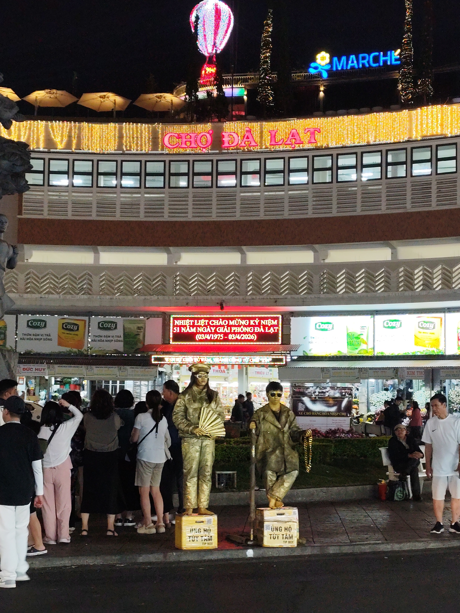 The image depicts a nighttime scene at Cho Da Lat, a marketplace in Da Lat, Vietnam. The multi-storied building has the words "CHO DA LAT" illuminated in pink and "MARCHE" with a flower design in blue on the roof. Festive lights are strung along the building's edges. Advertisements for "Cozy" tea and a banner celebrating the anniversary of the liberation of Da Lat (1975-2026) are visible. In the foreground, there are two street performers painted gold, posing on boxes labeled "UNG HO TUY TAM TIP BOX." A group of people are gathered around them. Other people are milling around in the background, browsing the market stalls. The sky is dark, with a lit hot air balloon-shaped structure in the upper center.