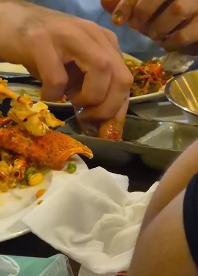 person eating crab, and then a plate of empty crab shells after the meal. The person is wearing a light grey t-shirt and has hairy arms. They use their hands to pick pieces of crab out of the shell and eat them. After the person finishes eating, a plate full of discarded crab shells is shown. The shells are mostly orange and white, and there are a few green peas and small yellow pieces of corn on the plate. There is a folded white napkin on the table and a turquoise bag.