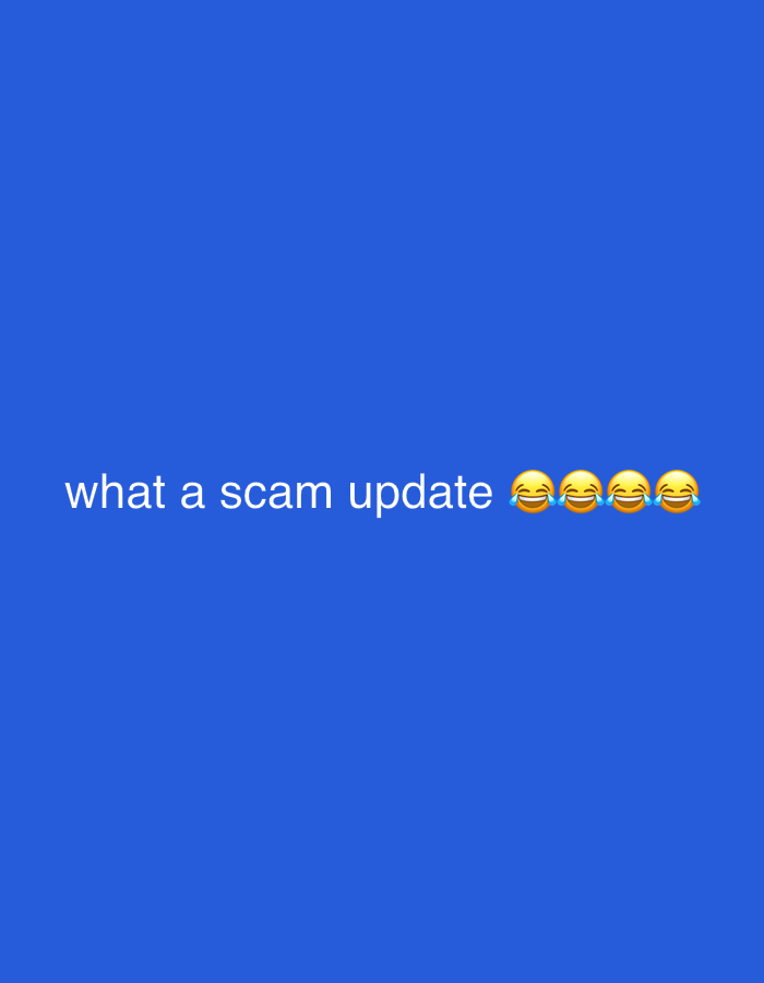 The image displays a digital graphic with a solid, uniform blue background. Centered horizontally on the image, slightly above the vertical midpoint, is white text that reads "what a scam update". Immediately following the text, extending to the right, are five "face with tears of joy" emojis (😂). No people, identifiable objects, actions, or interactions are depicted. The scene is abstract and does not represent a physical environment. There is no visual information within the image to indicate a specific geographical location, including the city of Dunfermline, United Kingdom.