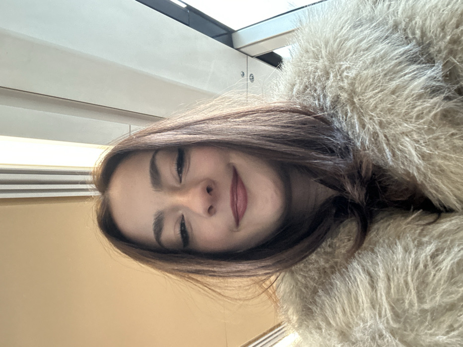 A headshot-style portrait features a female subject in an indoor environment, located in Bischheim, France. The individual, appearing to be a young to middle-aged adult, occupies the central frame from the chest up. She has shoulder-length, dark brown hair and a pale complexion, accented by visible eyeliner and reddish-brown lipstick. She is wearing a light brown or beige shaggy faux fur coat and exhibits a slight smile while looking directly forward. The background consists of an off-white ceiling with linear structural elements overhead. To the subject's right, a large window reveals ambient light and a partial view of an exterior or adjacent interior space, framed by dark mullions. No specific objects or further individuals are discernable beyond the subject and her immediate environment.