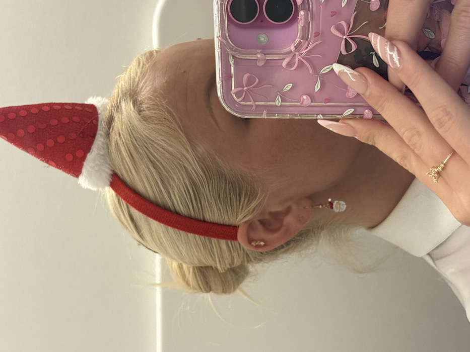 A close-up self-portrait of a fair-skinned individual with blonde hair styled in an updo is captured in an indoor setting. The specific location within Newcastle upon Tyne, United Kingdom, is not discernible from the image, which shows a plain, light-colored background wall. The subject's face is largely obscured by a mobile phone held in their left hand, which is visible. The subject wears a red fabric headband adorned with a small, glittery red conical party hat featuring a white faux fur trim. Their visible left ear displays two piercings: a gold-toned stud with small crystals in the helix, and a dangle earring in the lobe depicting a miniature Santa Claus figure with a red hat and white beard. A white collared shirt is visible on the subject's left shoulder and neck. The left hand holds a mobile phone, likely an iPhone, encased in a transparent pink protective cover decorated with white cherry branch motifs, pink bows, and small hearts. The fingernails are almond-shaped with a French manicure, featuring clear or pale pink bases and white tips; some nails include additional white swirling or wavy line designs. A thin, gold-toned ring with a small starburst or crown-like embellishment is worn on the left ring finger. No interactions with other individuals are depicted.