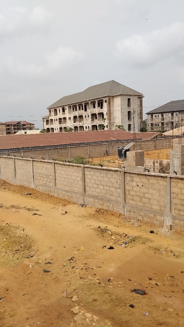 The image depicts a construction site and its immediate surroundings in Isieke, Nigeria, under an overcast sky
