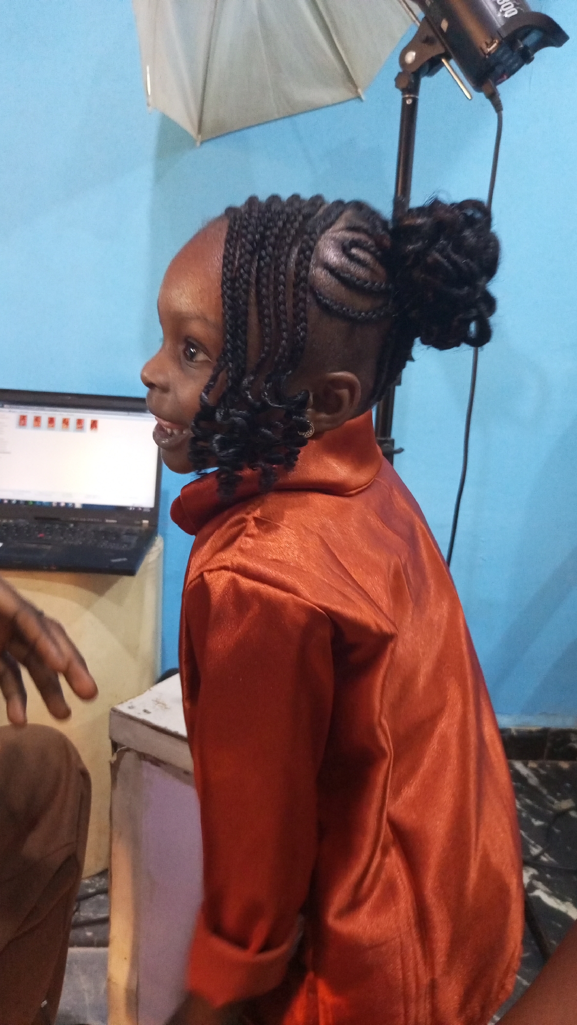 A young girl in a shiny red shirt stands in profile, facing left. Her hair is styled in cornrows with curled ends, and a bun at the back. Behind her, a light blue wall is visible, along with photography equipment including an umbrella light. A laptop sits on a white table to the left of the girl, and a hand is visible in the lower left corner. The location is Sabon Tasha, Nigeria.