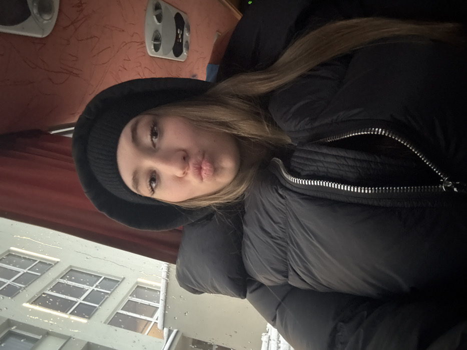 A person wearing a black knit hat and a puffy black jacket makes a kissing face towards the camera. The person has light brown hair. Outside a window, a light-colored building with several windowpanes is visible. Water droplets streak across the windowpane. An air conditioning unit is mounted high on the wall behind the person.