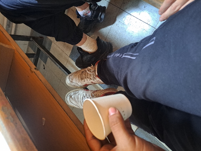 The image depicts a low-angle view of the lower bodies of two individuals seated at tables indoors. No specific location within Damascus, Syria is discernible from the image content. In the immediate foreground, a left hand with a darker skin tone holds a white paper cup. This individual wears dark blue or black sweatpants with partially visible light grey text on the left thigh, and dirty white sneakers with red accents on their feet. To the right, a second individual's lower legs and feet are visible. They wear black pants and black sneakers. One ankle has a light-colored sock appearing bunched or rolled down, with the heel partially out of the shoe. The other foot wears a white sock with "POLO" in red text. Both pairs of feet are positioned beneath a worn wooden table or desk, which has a dark metal frame support structure underneath. The floor is tiled with light-colored square tiles featuring scattered darker blue or grey rectangular accents. A bright reflection of light is present on the floor towards the right. No direct actions or interactions are visible beyond the individual holding the cup.