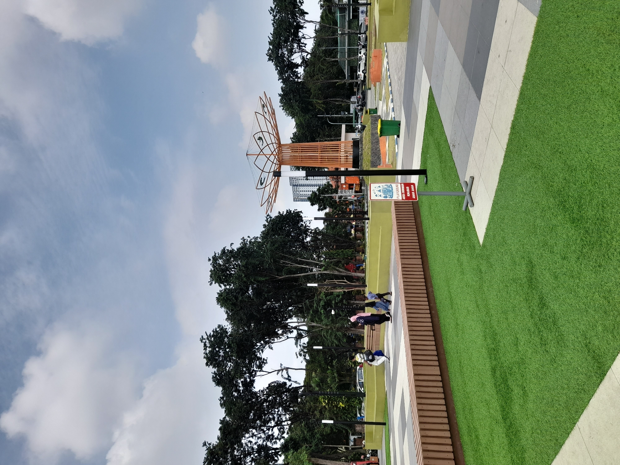 The image displays a public park area within Alun-Alun Sidoarjo, Sidoarjo, Indonesia, under a sky with scattered white clouds. The foreground features sections of bright green artificial turf segmented by pathways composed of light grey and dark grey paving tiles. A long, low bench structure with horizontal wooden slats forms a boundary along the left midground. To its right, on the artificial turf, a red-on-white sign on a grey pole reads "PLAYGROUND AREA BERMAIN KHUSUS ANAK ANAK" (Playground Area for Children Only). In the midground, a group of four individuals—an adult male, an adult female wearing a hijab, and two children—walks on a paved pathway from left to right. Several black pole streetlights with white cylindrical luminaires are distributed throughout the scene. A prominent, abstract, tree-like metal sculpture stands centrally, featuring an orange-brown latticed trunk and a broad, flat, multi-lobed top. This sculpture rests on a dark grey, rock-lined circular base. Two green waste bins are visible near the sculpture. The background is characterized by numerous tall, dense green trees forming a natural barrier. Behind these trees, a multi-story building is partially visible to the left. Roads with multiple parked and moving vehicles, including cars and vans, are present beyond the tree line, defining the park's urban periphery.