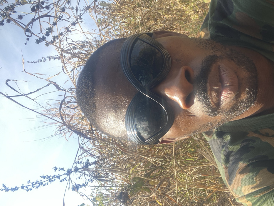 A close-up portrait photograph, taken in Zaki Biyem, Nigeria, features an adult male with dark skin and short, dark hair. He wears black, thick-framed sunglasses with a distinct ribbed, infinity-loop design connecting the lenses, obscuring his eyes. Sweat is visible on his forehead and nose. A scar is present on his left cheek. He has a mustache and a short beard. The man is wearing a camouflage-patterned shirt. The background consists of tall, dry, light brown and yellowed wild vegetation, including some plants with dark seed heads, under a clear, bright blue sky. The scene is outdoors under strong sunlight.