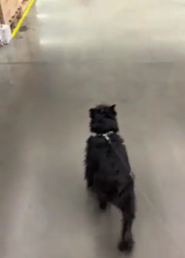 A small, black dog with wiry fur walks on a leash across a gray concrete floor in a store. The dog is heading away from the camera, towards shelves stocked with goods. The shelves are decorated with holiday-themed packaging. A person's legs can be briefly seen walking in the same direction. The scene is well-lit.