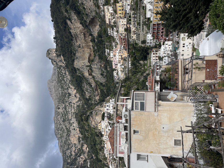 This image presents a terraced urban landscape ascending a steep hillside, located in Arienzo, Italy, under an overcast sky