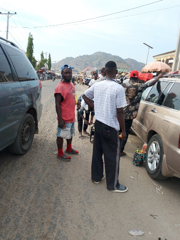 On a sunny day, a group of people stand by vehicles on a street with a mountain visible in the background. One man wears a red shirt, blue cap, and shorts, looking directly at the camera. Another man in a white shirt and black pants faces away. Nearby, a gold-colored car is parked next to a man in a patterned shirt. The scene captures a casual street setting with elements of daily life and transport.