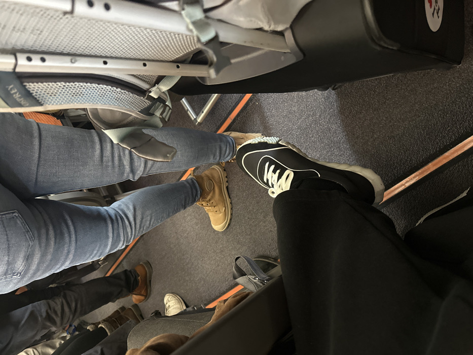 The scene depicts the interior of an aircraft cabin at Berlin Brandenburg Airport (BER) in Schönefeld, Germany. In the immediate foreground, the legs and feet of a seated individual are visible, clad in black trousers and black sneakers with white laces and a light-colored, translucent sole. Directly in front, a person stands, viewed from the waist down, wearing light blue denim jeans and tan, robust boots with thick soles. To the right of this standing individual, a portion of a grey and black Osprey-branded backpack frame is visible, positioned adjacent to a dark-colored aircraft seat structure. Further into the background, additional legs and feet in dark brown and white footwear are discernible. The floor is carpeted in dark grey, accented by orange strips along what appear to be seat rails or aisle edges. A white circular sticker with red text, partially reading "Made with love," is affixed to the lower section of a seat back.