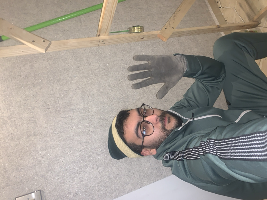 A male individual is depicted in a squatting position indoors in Ouislane, Morocco. He has dark hair, a beard, and wears round eyeglasses with dark frames. His head is covered by a knit beanie striped in dark green and beige. He is dressed in a dark green tracksuit with a central zipper and a black and white striped pattern along the outer side of the left sleeve. His left hand, covered by a grey work glove, is raised with the palm directed towards the viewer. The individual is looking directly into the camera. The background consists of a light grey, textured wall. A white rectangular object, possibly an electrical plate or junction box cover, is partially visible on the far left edge of the frame. To the right of the individual, a partial wooden structure constructed from light-colored planks joined by screws is present. Behind this wooden structure, a bright green pipe extends vertically, and a yellow and green measuring tape hangs.