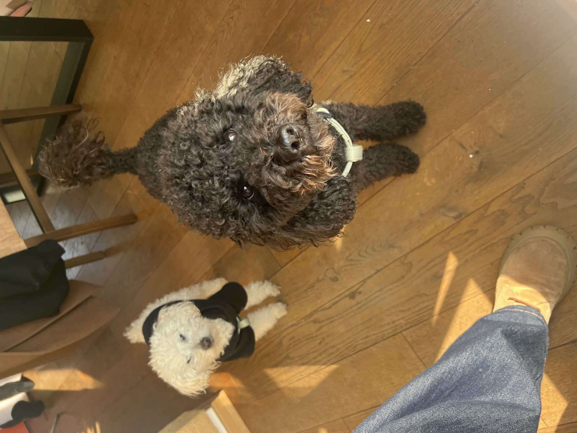 - "A black poodle and a smaller, white poodle wearing a black sweater lie on a hardwood floor" by FM-7JjJg1, licensed under CC BY 4.0