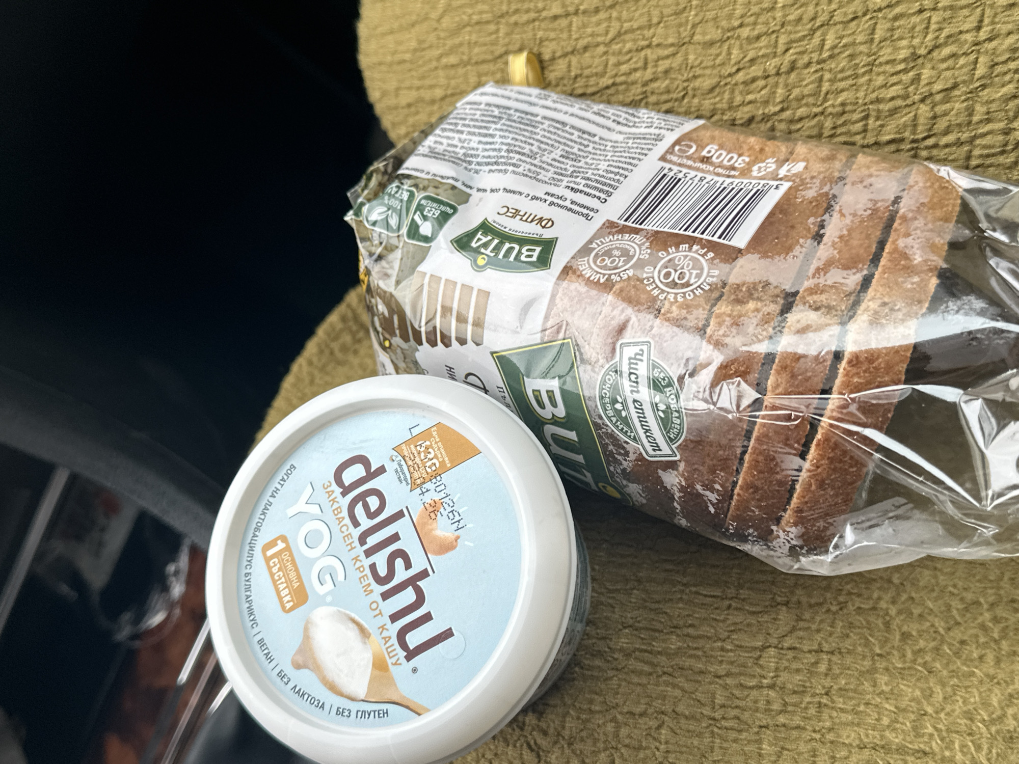 package of Vita Fitness bread, a container of Delishu cashew cream yogurt, and a tan, textured surface, possibly a car seat or a piece of furniture. The Vita Fitness bread is sliced and packaged in clear plastic. The label has text in Cyrillic, indicating it is a protein bread with various seeds, including spelt, soy, chia, and flax seeds. The text on the label reads "100% цельнозърнест" (whole grain) and "Фитнес" (fitness). The barcode and weight (300g) are visible. The Delishu yogurt container is white with a light blue label. The label features an image of yogurt on a wooden spoon. The text in Cyrillic describes the product as "ЗАКВАСЕН КРЕМ ОТ КАШУ" (fermented cashew cream) and "YOG 1 ОСНОВНА СЪСТАВКА" (Yog 1 basic ingredient). It also notes that it is vegan, lactose-free, and gluten-free. Assuming these items are from a grocery store and sold in Bulgaria, and without additional visual information or evidence, a specific location in Sofia, Bulgaria cannot be definitively determined.