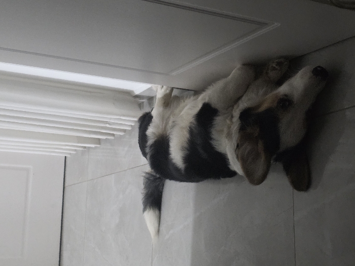 A dog lies upside down near a wall and doorframe. The dog has black and white fur, and its tail has a white tip. Its paws are tucked in close to its body. The wall is a light gray color with large, square tiles. The doorframe is white with decorative molding. The dog seems relaxed in this unusual position.
