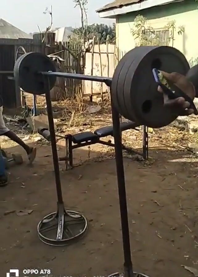 people gathered around an outdoor weightlifting bench. The bench press setup is made of metal and has weights loaded on the bar. Some people are standing and talking, while others are sitting. The setting appears to be a backyard or outdoor area with a mix of grass, dirt, and buildings in the background.