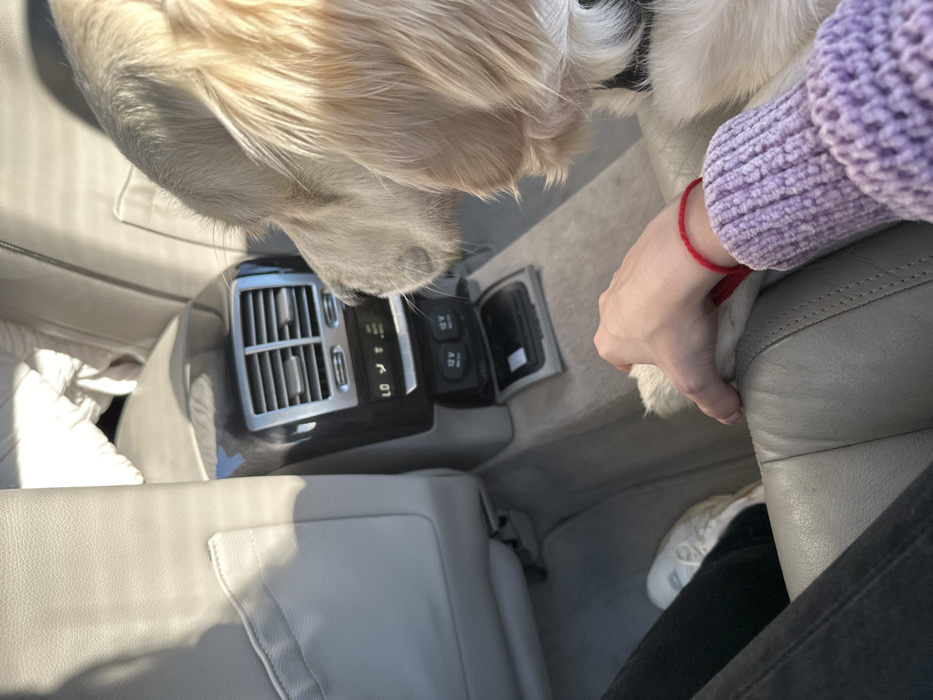 The image depicts the interior of a vehicle in Brentwood, United Kingdom, specifically the rear passenger area. A Golden Retriever dog with light golden fur is partially visible on the right-hand rear seat, its head facing towards the front of the vehicle. A fair-skinned left human hand, wearing a red string bracelet on the wrist and a purple knitted sleeve, is holding the dog's right paw, resting on the light-colored seat cushion. The vehicle features light-colored leather or synthetic leather seats and a light-colored carpeted floor. A dark-colored rear console is visible between the front seats, equipped with dual silver-trimmed air vents, digital climate controls displaying "LO" and fan icons, and two 12V power outlets positioned above a small storage tray. Strong sunlight enters from the right, casting distinct shadows. A white sneaker is partially visible on the floor, suggesting a human foot.