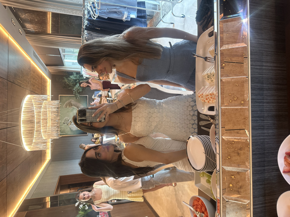 The image displays an indoor scene captured as a reflection in a mirror, primarily featuring three young adult females in the foreground, positioned in front of a buffet counter. The central female, with long brown hair and wearing a white sleeveless dress with a circular pattern, is taking the photograph with a smartphone, which obscures her face. To her left, a female with long dark hair in a white textured sleeveless dress gazes towards the camera's general direction. To the right, another female with long brown hair in a light blue textured sleeveless dress also looks towards the camera. The immediate foreground reveals a buffet station with various food items. These include bowls of cut papaya and strawberries, a tray of green grapes, a stack of white oval plates with dark rims, serving utensils, and a white rectangular platter holding three distinct types of sliced desserts or cheeses, alongside a serving fork. The background, visible in the mirror's reflection, depicts an upscale interior. A multi-tiered circular chandelier hangs from the ceiling, complemented by linear perimeter lighting. The walls and ceiling feature wooden paneling. A large framed artwork, depicting an abstract or surreal figure, is mounted on a distant wall, with a tall potted plant positioned to its right. Multiple additional individuals are seen socializing or moving within the reflected space; notable figures include a female in a yellow striped dress, a male in a white shirt, and a female in a pink top. A clothing rack displaying various garments is visible on the far right, indicative of a retail display or private showing. The specific location within the city of Monterrey, Mexico, cannot be determined from the visual evidence presented in the image. The environment suggests a modern, well-appointed private event space, boutique, or showroom.