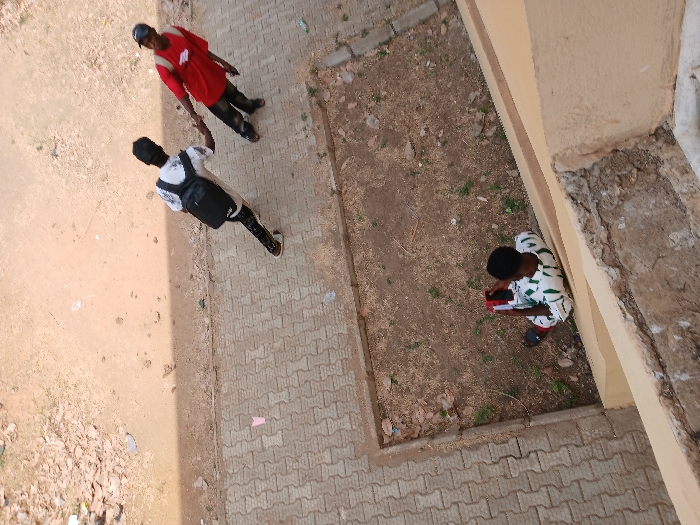 An overhead view captures an outdoor scene in Ugi Majowel, Nigeria. The ground surface consists of a light-colored paved pathway on the left, transitioning to a strip of dry earth with sparse vegetation, and then a larger area of bare, light brown soil on the right. A light-colored building wall with some textured damage occupies the extreme left edge of the frame. Three individuals are present. One person, with dark hair, is seated on the dry earth patch, leaning against the building wall. This individual wears a white short-sleeved top with an irregular green pattern and dark trousers. They are holding a red rectangular object, possibly a book or tablet, and are looking down at it. Two other individuals stand on the paved pathway, oriented generally towards the lower-right quadrant of the frame. The first, closer to the center, wears a white t-shirt, a black backpack, and dark trousers. The second, positioned slightly further right and forward, wears a red short-sleeved t-shirt and dark trousers. A distinct linear shadow extends vertically across the right side of the paved area and adjacent dirt.