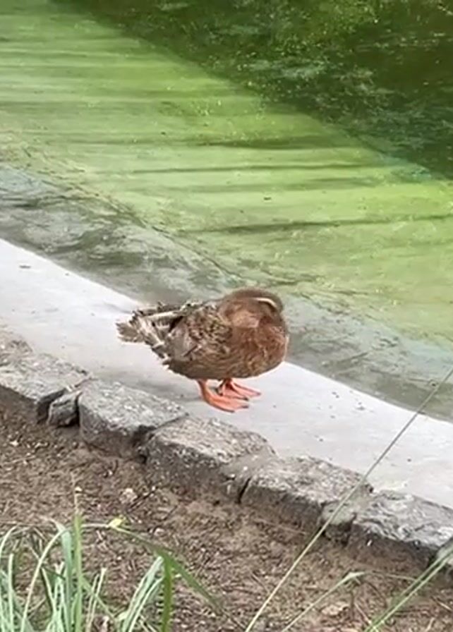 brown duck standing on a concrete ledge beside a green, algae-covered pond