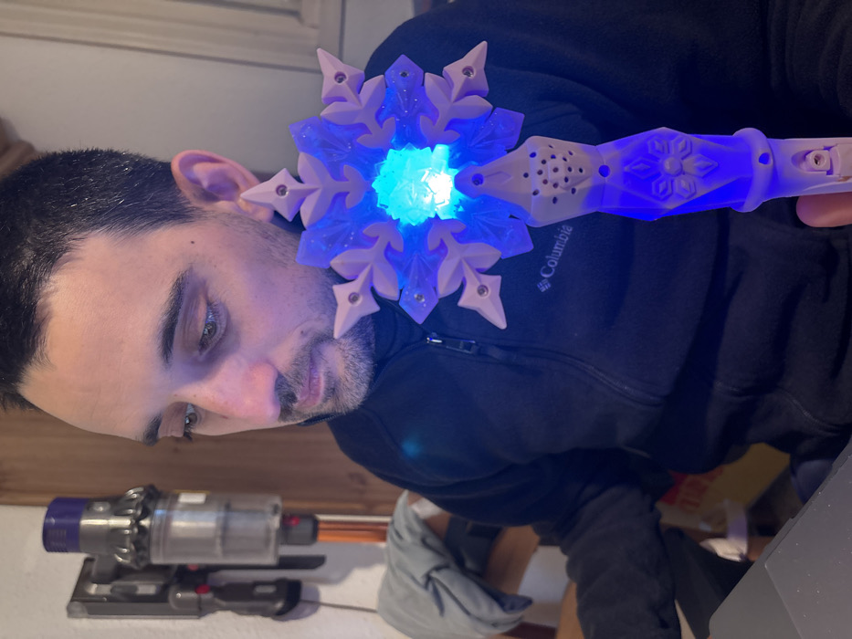 An adult male with short dark hair and light facial stubble is depicted seated indoors, angled slightly to his left. He wears a dark, zippered fleece jacket, featuring a "Columbia" brand logo on the left chest. His gaze is directed downwards and to his left. In his right hand, positioned in the foreground, he holds a translucent, light-purple plastic snowflake-shaped light-up wand. The wand's central snowflake element and handle emit a bright blue light. In the background, a gray Dyson V-series cordless vacuum cleaner with a purple dustbin and an orange extension wand is mounted on a light-colored wall. Adjacent to this, a vertical wooden panel is visible. A gray folded textile rests over a piece of furniture behind the man's left shoulder, and the edge of a gray laptop or tablet is partially visible in the lower-left portion of the frame. The scene is consistent with a domestic interior setting. The specific location within Tel-Aviv, Israel, cannot be determined from the visual evidence presented.