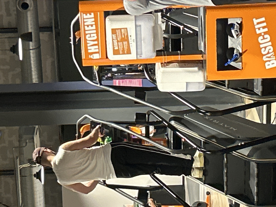 A man in a white tank top and black pants stands near a treadmill. He holds a phone up as if taking a photo. An orange hygiene station labeled "BASIC-FIT" and "HYGIENE" is on the treadmill behind him. An overhead light fixture is visible in the background, along with other indistinct figures.