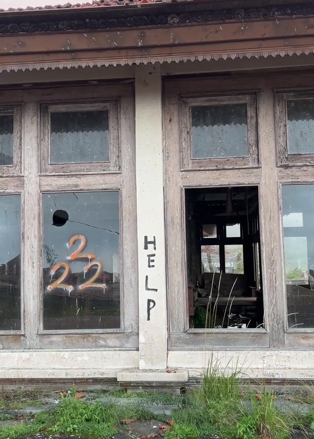 n exterior view of a dilapidated building. The building has large windows, many of which are broken. The number "222" is spray-painted on one window, and the word "HELP" is written vertically on a pillar between two windows. The building appears abandoned, with overgrown grass and broken tiles on the ground in front. The scene evokes a sense of decay and neglect. The sky is overcast.