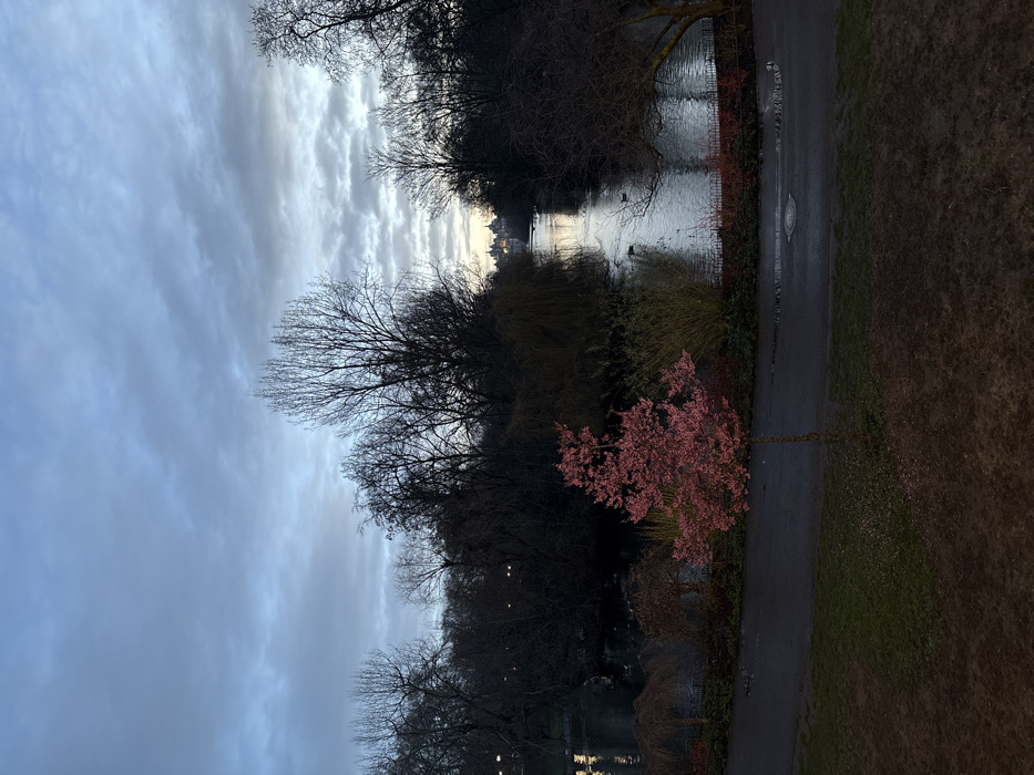 A dusky landscape features a path dividing a grassy area and a serene lake lined with trees. Bare branches silhouette against a cloudy sky, hinting at twilight. A striking pink-blossomed tree stands out, adding a touch of vibrant color to the muted scene. Reflections shimmer on the water, mirroring the distant light and creating a peaceful, almost ethereal atmosphere.