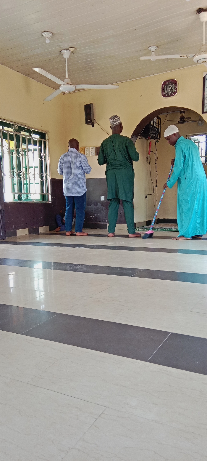 The image displays an indoor scene in Lokoja, Nigeria, featuring a light-colored tiled floor with dark gray horizontal bands, light yellow upper walls, and dark brown lower walls. A white paneled ceiling supports three white ceiling fans and multiple light fixtures. Four individuals are present, all appearing barefoot. In the foreground, an adult male wearing a light blue thobe and white kufi sweeps the floor with a broom featuring a multicolored handle and black brush head. To his left, an adult male in a dark green kaftan and patterned kufi stands facing away from the camera. Further left, another adult male in a blue checkered long-sleeved shirt and blue jeans also stands facing away. A fourth individual, partially visible in the lower left corner near the floor, appears to be sitting or kneeling. Architectural features include a large window with green metal security bars on the left wall, allowing natural light. Two black wall-mounted speakers are visible, one on the left wall near the window and another on the right wall. A red-framed square wall clock, indicating approximately 12:45, is mounted on the right wall above a dark arched opening. Various electrical outlets and exposed wiring are also present on the walls. A folded green prayer mat is visible on the floor near the individual sweeping.