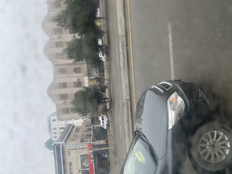 A rainy street scene features a dark car in the foreground, its hood and headlight visible. The road is wet, with a solid yellow line defining the curb. Buildings line the opposite side of the street, interspersed with trees. One distinct building exhibits arched architectural details, while another is a two-story structure with visible signage. A white vehicle and a couple more cars are parked along the street. The overall atmosphere suggests overcast or rainy weather.
