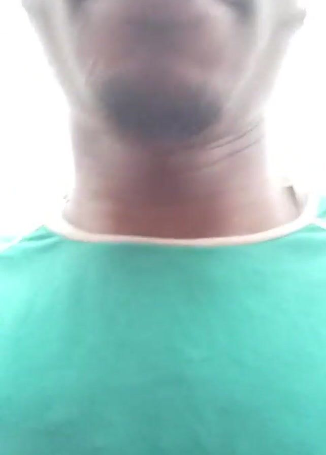 A person wearing a green t-shirt with white trim on the neckline and shoulders is the primary focus of the video. The camera appears to be handheld, positioned close to the person's upper body. The background is blurry and out of focus.