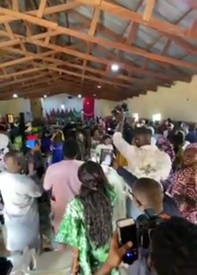The video captures a lively wedding celebration inside a large hall with a wooden beam ceiling. A bride in a white lace dress is dancing and smiling amidst a crowd of guests. Many guests are holding up their phones to record her. Some people are wearing traditional African clothing. The walls are painted a light color and are decorated with flags and celebratory decor. A professional camera operator is visible, capturing the event. The atmosphere is festive and joyful.