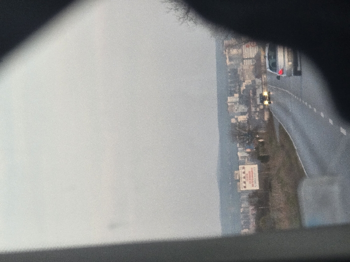 The image depicts an exterior view observed from within a vehicle, showing a paved road leading towards an urban area under an overcast sky, located in Drazhevo, Bulgaria