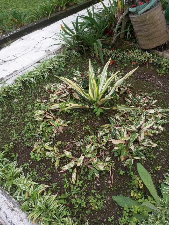 This image depicts an outdoor garden bed in Unknown, Vietnam, viewed from an elevated perspective. The central subject is a large, variegated plant with stiff, lanceolate leaves featuring prominent cream and green stripes, positioned in the upper-mid section of the frame. Surrounding this central plant in a roughly circular formation are multiple clusters of smaller, variegated foliage plants characterized by green leaves with irregular white and cream patterns. The garden bed consists of dark soil, substantially covered by small, green herbaceous groundcover plants. Along the lower-left and bottom edges, a row of slender, grass-like variegated plants with green and white stripes borders the scene. A white, cracked concrete curb or path is visible along the upper-left perimeter, separating the garden bed from an adjacent area with green foliage. In the upper-right corner, a partially visible brown, cylindrical object, resembling a tree stump or rustic planter, is present, topped with a green container element. No individuals or active subjects are depicted.