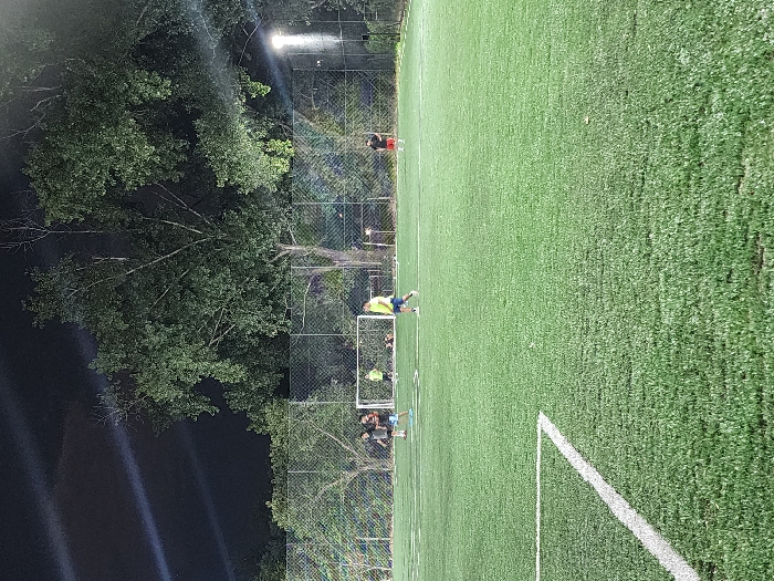 The image displays an artificial turf soccer field at night in Unknown, Unknown