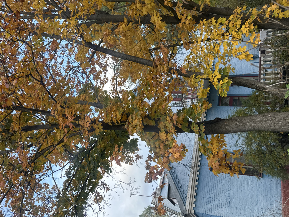 The image displays a residential street scene in Irpin, Ukraine, in autumn. The foreground and midground are dominated by several large deciduous trees, exhibiting foliage in shades of yellow, orange, and some lingering green. These trees partially obscure a two-story house constructed of light blue painted brick. The house features a dark, pitched roof with a visible dormer window on the left side, from which a slender, dark, antenna-like fixture protrudes vertically. A white decorative trim band runs horizontally along the eaves and a lower architectural line on the house's exterior. A rectangular window with a dark frame is visible on the left side of the house's lower level, partially covered by foliage. On the right side, an upper-story window with a red frame is visible. Beneath this window, a small balcony or porch structure with white balusters and a dark handrail is discernible behind the trees, adjacent to what appears to be a dark-framed entrance door. Green bushes and undergrowth are present at the base of the trees and the house. Patches of a pale blue sky with scattered white clouds are visible through the gaps in the tree canopy. No individuals, animals, or vehicles are present in the frame.