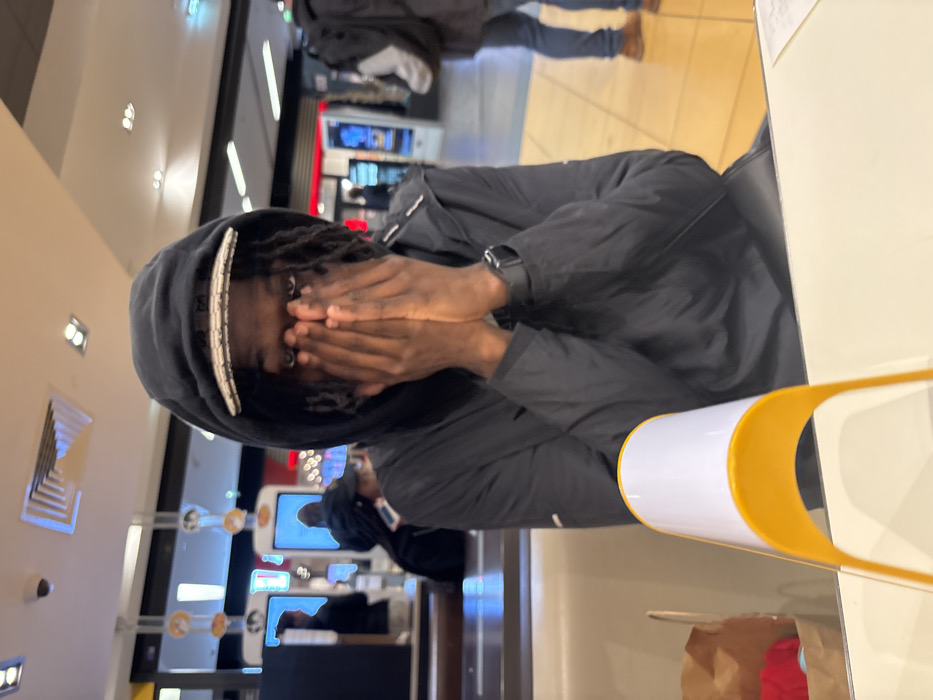 The image captures an indoor scene within a modern McDonald's restaurant in Strasbourg, France. In the foreground, a person with dark skin and dreadlocks or braids is seated at a light-colored table. They are wearing a black hooded jacket and a white and dark patterned visor or cap under the hood. Their hands are covering the lower part of their face, with their eyes looking directly at the camera. A black digital watch is visible on their left wrist. On the table in front of this individual rests a white order locator or table number device with a yellow, inverted U-shaped base. To its left, a partially visible brown paper bag contains red fabric or packaging. A white paper receipt or slip is on the table to the right. The background shows other patrons and restaurant features. To the left, another person in a black hooded garment and cap is seated, facing away, near a standing individual and several brightly lit self-service order kiosks with blue and white screen interfaces. To the right, the lower half of a person wearing blue jeans and brown shoes, carrying a dark backpack, is visible, indicating passage through the dining area. The ceiling features recessed lighting, a ventilation grate, and a security camera. The overall environment is well-lit and consistent with a contemporary fast-food establishment.