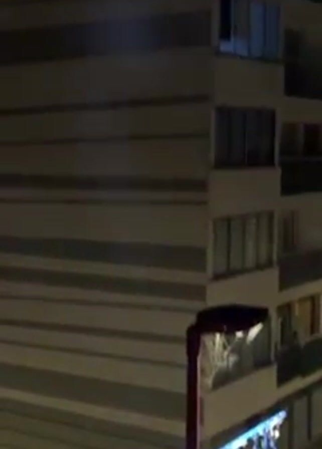 - "The camera pans up from a street lamp adorned with blue lights to reveal a multi-story building with horizontal stripes" by FM-dz8in2, licensed under CC BY 4.0